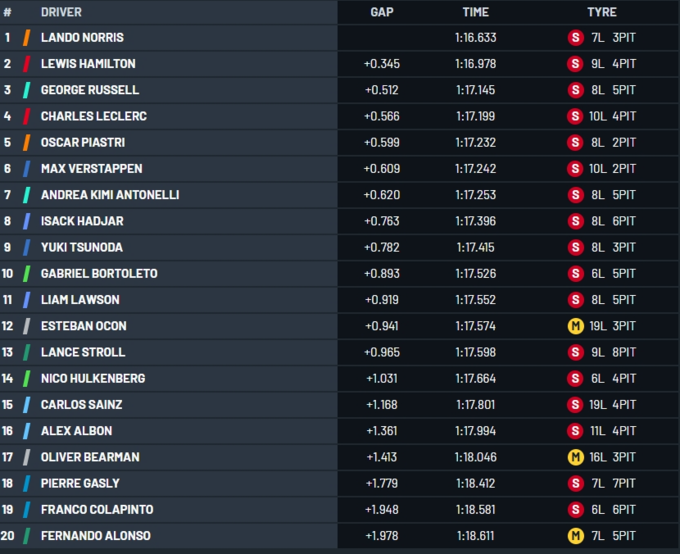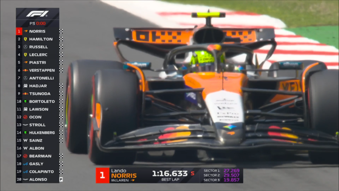 Лучшее время по итогам тренировки показал пилот Макларена Ландо Норрис, который выдал одну классную попытку и с тремя лучшими секторами значительно опередил конкурентов.