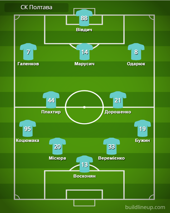 СК «Полтава»: Восконян – Коцюмака, Мисюра, Веремиенко, Бужин – Плахтырь (Хахлев, 61), Дорошенко (Опанасенко, 61) – Галенков (Кононов, 81), Марусич (Шаповалов, 81), Одарюк – Вивдыч (Стрельцов, 90+4).