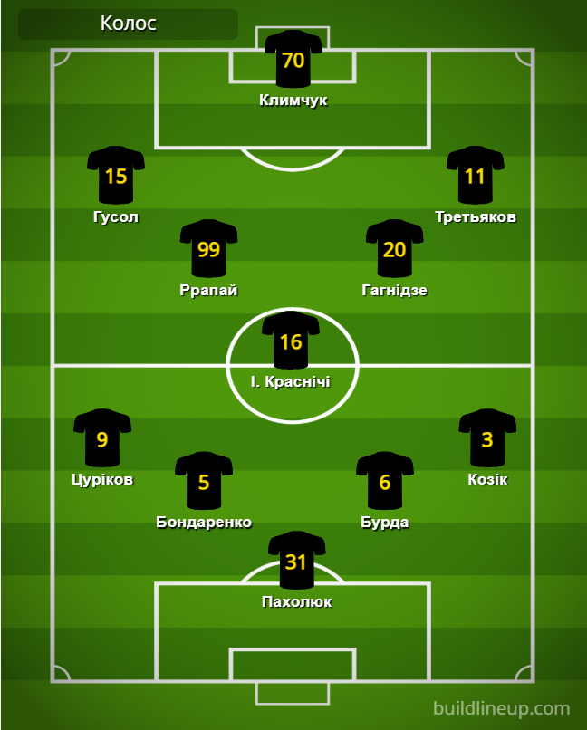 «Колос»: Пахолюк – Цуриков, Бондаренко, Бурда, Козик (Понедельник, 46) – Ррапай (Теллес, 56), И. Красничи, Гагнидзе – Гусол (А. Красничи, 81), Климчук (Оевуси, 56), Третьяков (Алефиренко, 46).