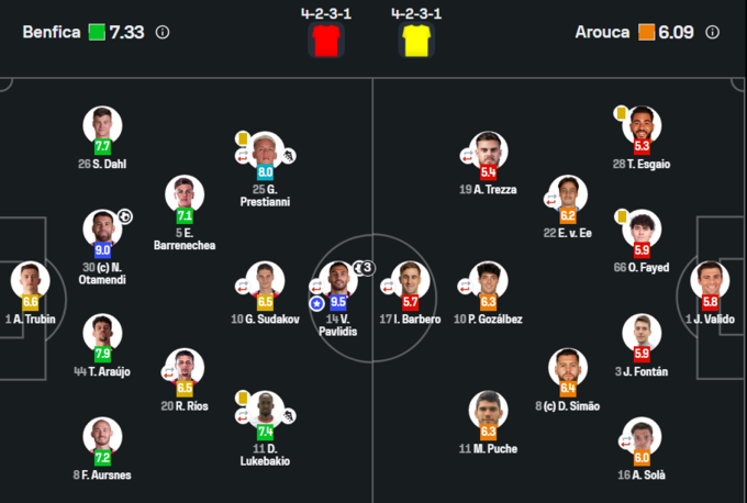 Украинский вратарь «Бенфики» Анатолий Трубин провел на поле весь матч, голов не пропустил. Статистические порталы SofaScore и WhoScored оценили игру футболиста в 6.6 баллов.