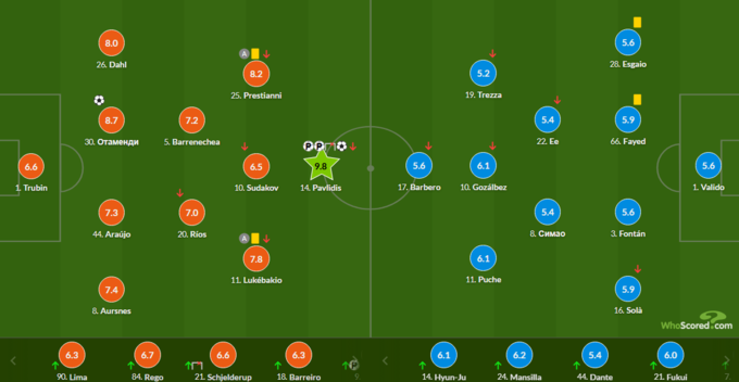 Лучшим по версии обоих порталов стал нападающий хозяев Вангелис Павлидис, на счету которого хет-трик и оценки 9.5 и 9.8.