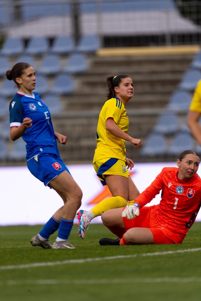 На 14-й минуте Николь Козлова воспользовалась ошибкой соперниц в штрафной площади: первым касанием подработала мяч, а вторым точно пробила в ворота (1:0). Хозяйки быстро сравняли счет. На 22-й минуте капитан Словакии Миколаева без помех пробила издали – мяч попал точно в верхний угол ворот (1:1).