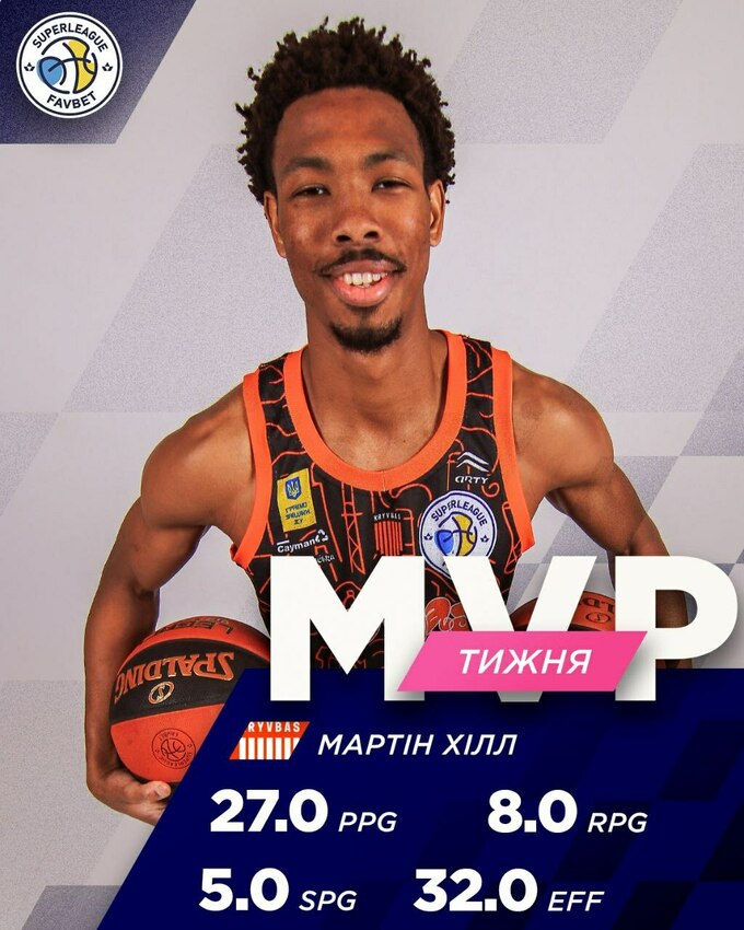 MVP тура признан американский защитник «Кривбасса» Мартин Хилл, который провел очередной качественный матч за криворожцев, помог своей команде одержать вторую победу в сезоне и подтвердил статус одного из лучших игроков чемпионата на старте сезона.