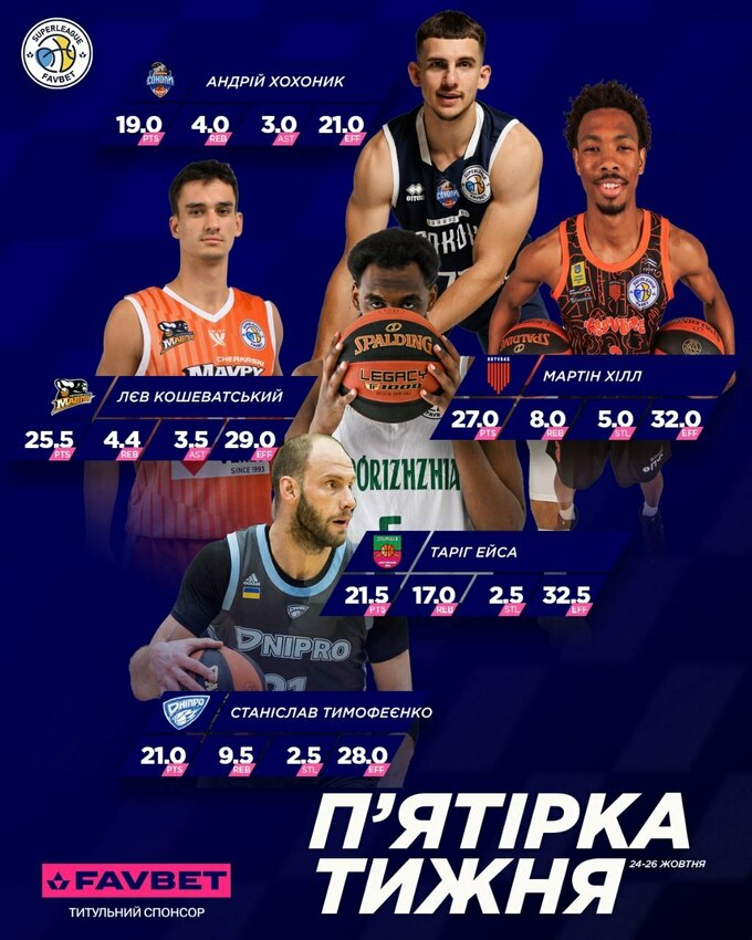 Лев Кошеватский (Черкасские Мавпы, 2 матча) – 25.5 очка, 4.4 подбора, 3.5 передачи (РЭ 29.0)