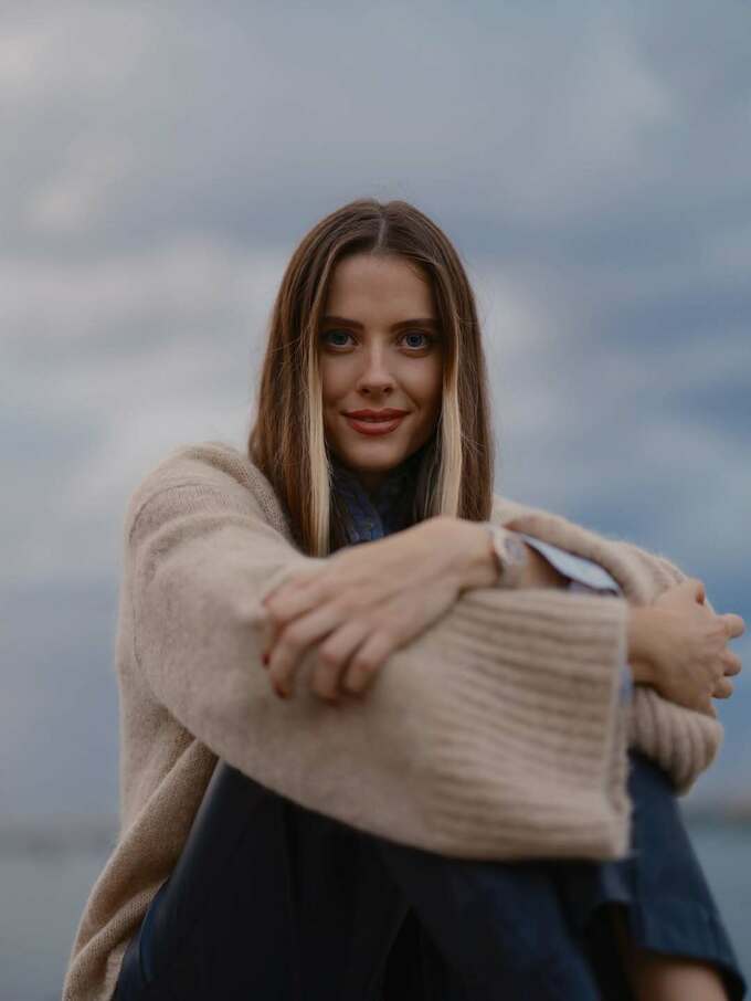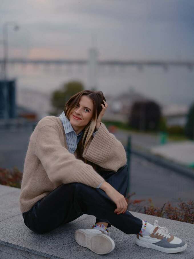 Атмосфера кадров – теплая и спокойная, на фоне Днепра и моста, что добавляет снимкам осенней меланхолии.
