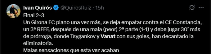 Ivan Quirós: ФК «Жирона» снова не очень впечатлила, сыграла вничью после неудачного (или даже худшего) второго тайма (1:1), что заставило их играть 30 минут дополнительного времени, где голы Цыганкова и Ваната наконец решили судьбу. Эти неудавшиеся выступления наконец-то закончились...