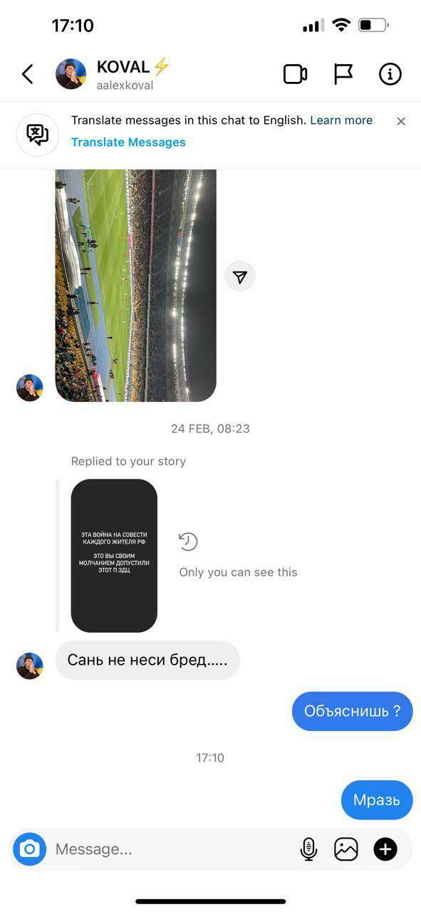 Вы знаете, когда находишься в подвале с полуторагодовалым ребёнком и всей семьёй, а мы уже находились в оккупации, потому что на нашем дворе стоял российский танк, то кроме слова «мразь», которое я ему написал, подобрать к этому человеку что-то лучшее я не мог. Это было лучшее, что я мог сказать. На этом наше общение завершилось, я его заблокировал. Несмотря на этот конфликт, я всё равно относился с уважением к его отцу, к этой семье, к достижениям, которые когда-то сделал этот отец для украинского футбола.