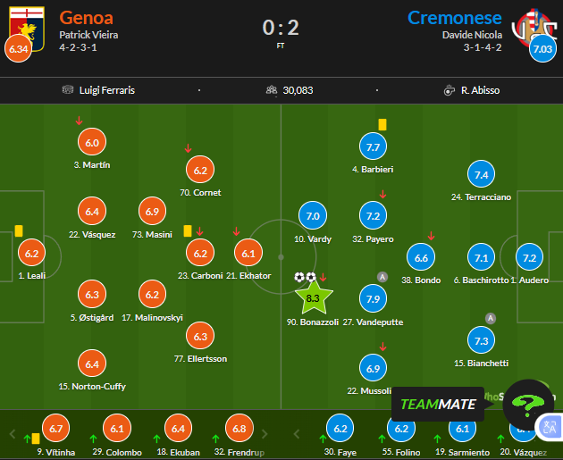 Оценки WhoScored за матч Дженоа – Кремонезе (0:2)