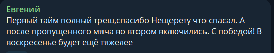 Евгений: Первый тайм полный треш, спасибо Нещерету, что спасал. А после пропущенного мяча во втором включились. С победой! В воскресенье будет ещё тяжелее.