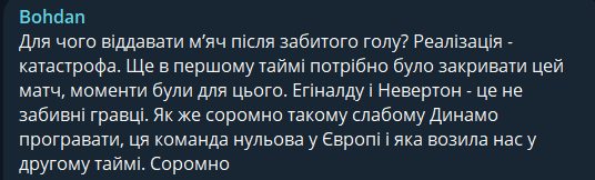 Bohdan: Зачем отдавать мяч после забитого гола? Реализация – катастрофа. Еще в первом тайме нужно было закрывать этот матч, моменты были для этого. Эгиналду и Невертон – это не забивные игроки. Как же стыдно такому слабому Динамо проигрывать, эта команда нулевая в Европе и возившая нас во втором тайме. Стыдно.