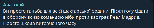 Анатолій: Вы просто позор для всей шахтерской семьи. После гола садиться в оборону всей командой как против вас играет Реал Мадрид. Просто жаль потраченного времени.