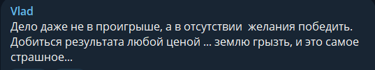 Vlad: Дело даже не в проигрыше, а в отсутствии желания победить. Добиться результата любой ценой... землю грызть, и это самое страшное...