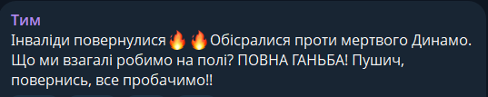 Тим: Инвалиды вернулись. Оборвались против мертвого Динамо. Что мы вообще делаем в поле? ПОЛНЫЙ ПОЗОР! Пушич, вернись, все простим!!