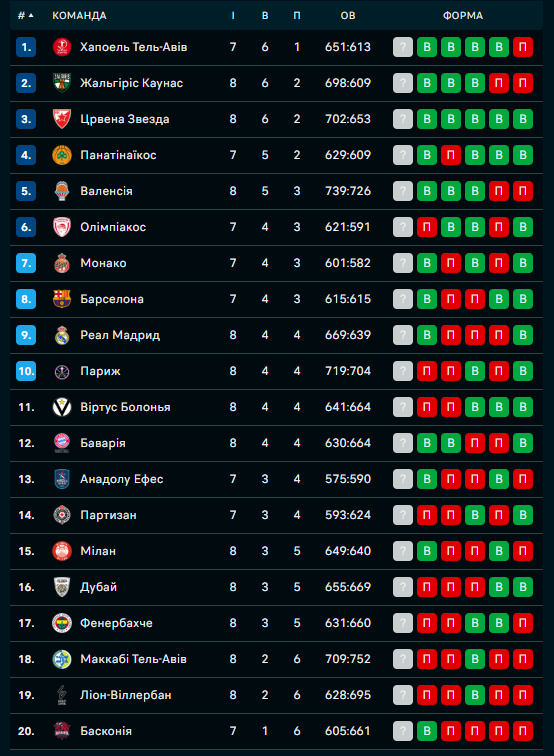 Действующих чемпионов Евролиги по-прежнему лихорадит, поэтому они с рекордом 3/5 находятся аж на 17 месте в таблице.