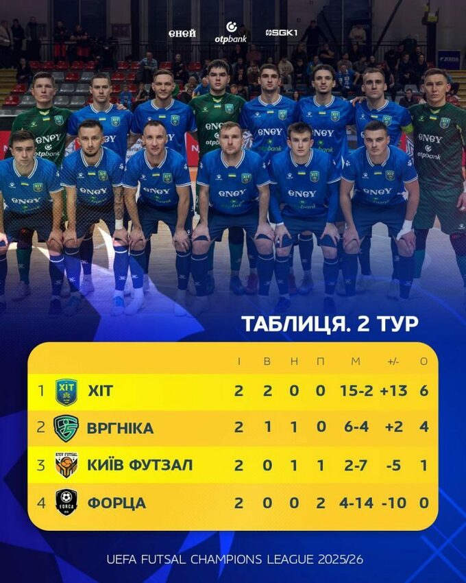 Турнирное положение: ХИТ Киев (6 очков), Врхника (4), Kyiv Futsal (1), Форца (0).
