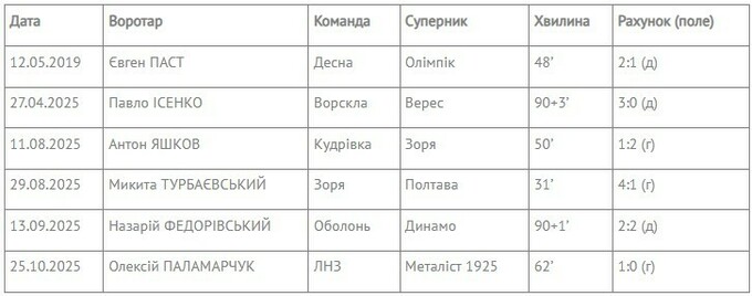 Голевые передачи вратарей в матчах УПЛ (с сезона 2018/19)
