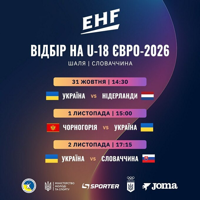 В пятницу, 31 октября, мужская сборная Украины по гандболу U-18 проведет первый матч квалификации Евро-2026. Первым соперником станет сборная Нидерландов. Начало встречи в 14:30.