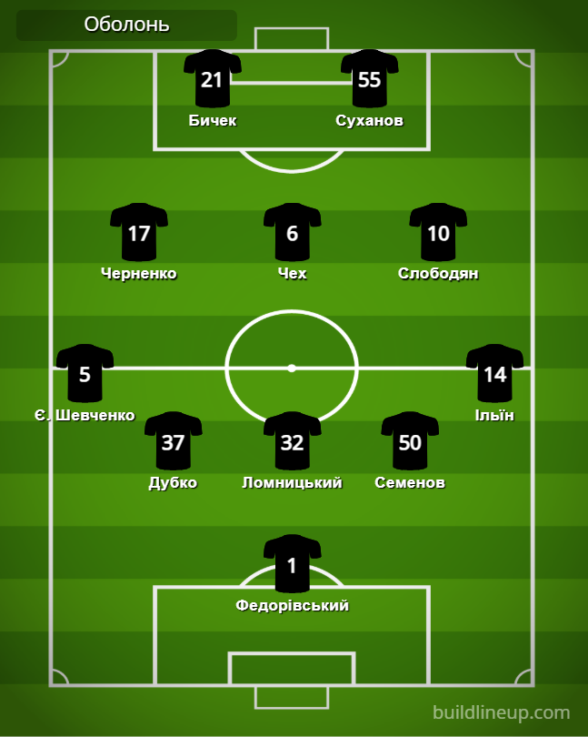 «Оболонь»: Федоривский – Е. Шевченко (Мединский, 84), Дубко, Ломницкий, Семенов (Е. Пасич, 73), Ильин – Черненко (Товарчи, 84), Чех, Слободян – Бычек (Нестеренко, 73), Суханов (Прокопенко, 77).