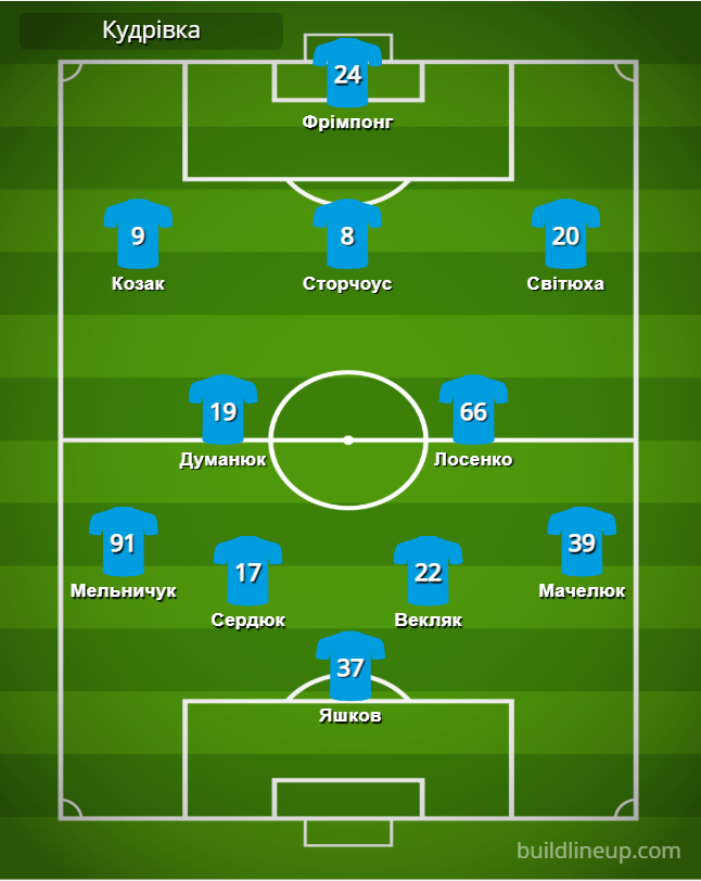 «Кудровка»: Яшков – Мельничук, Сердюк, Векляк (Мамросенко, 90+1), Мачелюк – Думанюк, Лосенко (Матвеев, 90+1) – Козак, Сторчоус (Легостаев, 74), Свитюха (Морозко, 59) – Фримпонг (Литовченко, 74).
