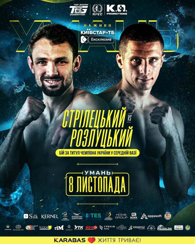 - Евгений Розлуцкий (7–0–1, 5 КО) – Юрий Стрилецкий (4–0, 0 КО). Бой за вакантный титул чемпиона Украины в среднем весе (до 72,6 кг)