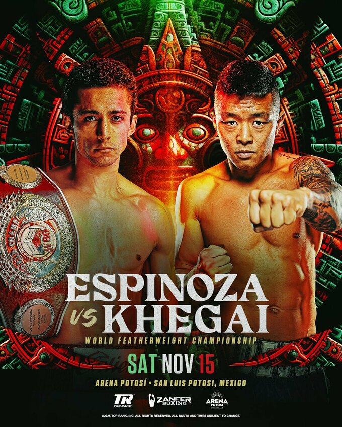 - Рафаэль Эспиноса (27–0, 23 KO) – Арнольд Хегай (23–2–1, 14 KO). Бой за титул чемпиона мира по версии WBO в полулегком весе (до 57,2 кг)