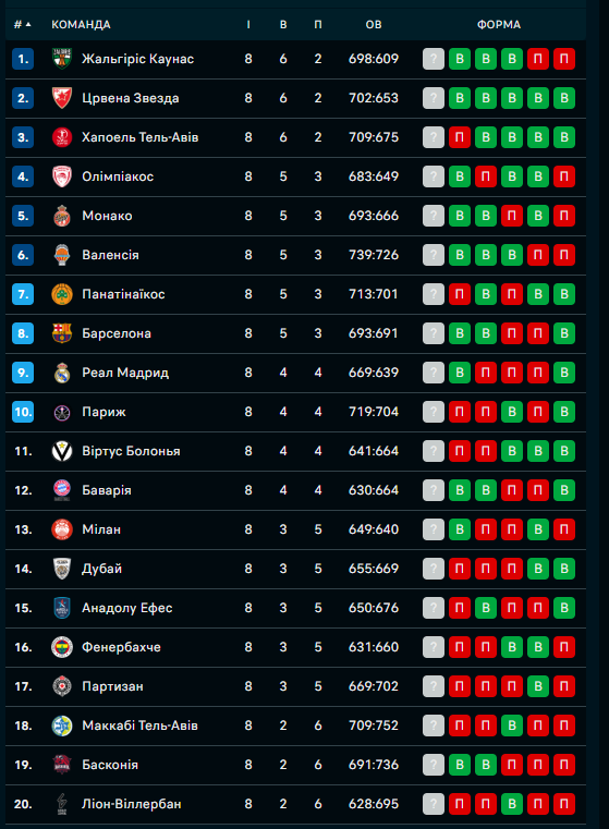 31 октября в Евролиге были сыграны четыре заключительных матча восьмого тура, по итогам которых произошла смена лидера.