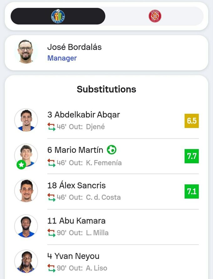 Лучшим игроком матча (7,7 баллов) стал испанский полузащитник Марио Мартин, который вышел на поле во втором тайме и огорчил голкипера каталонской команды на 72-й минуте.