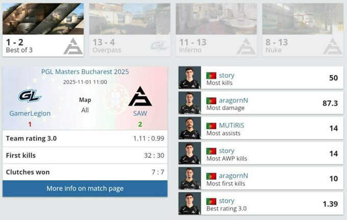 Команда SAW заняла третье место на PGL Masters Bucharest 2025, обыграв GamerLegion со счетом 2:1. Португальцы проиграли на Overpass (4:13), но сумели переломить ход матча на Inferno (13:11) и Nuke (13:8).