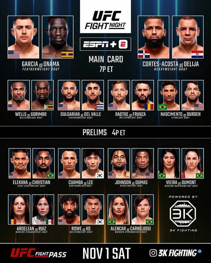 Предварительные бои стартуют 1 ноября в 22:00, основной кард запланирован на 2 ноября в 1:00. Гарсия и Онама выйдут в октагон ориентировочно в 03:30 по киевскому времени.