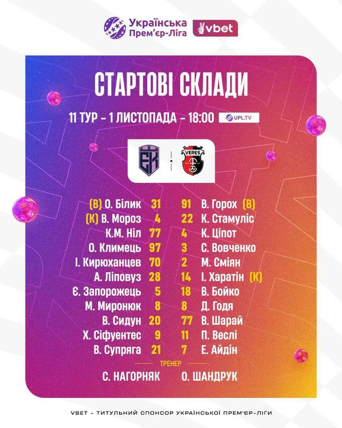 Стартовые составы команд на матч «Эпицентр» – «Верес»