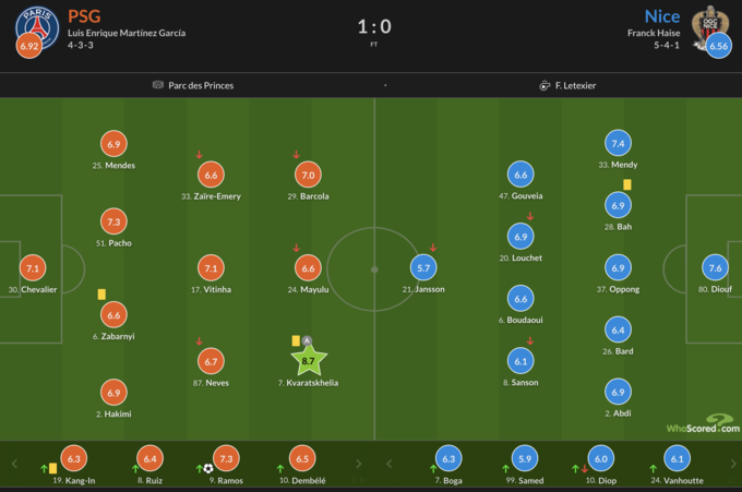 Героем поединка стал Хвича Кварацхелия, который сумел отдать результативную передачу и получить оценку 8,7 баллов.