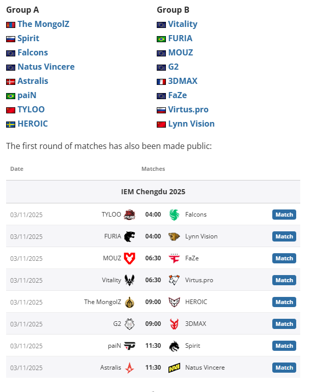 В группе B фаворитом считается Vitality, которые вернулись к победам на ESL Pro League Season 22. После стартового поражения от Gentle Mates команда выиграла шесть матчей подряд и подняла трофей в Швеции, обыграв таких соперников, как FURIA, G2 и FaZe – все они также вошли в группу B на IEM Chengdu.
