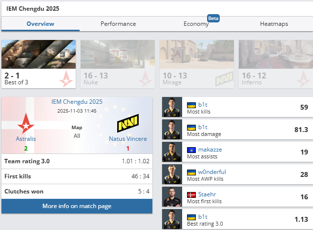 Первый игровой день IEM Chengdu 2025 завершился поражением украинского клуба Natus Vincere от Astralis со счетом 1:2. Датчане одержали победы на Nuke (16:13) и Inferno (16:12), в то время как NAVI взяли Mirage (13:10).