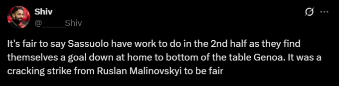 Shiv: Справедливо сказать, что «Сассуоло» есть над чем работать, ведь они уступают дома «Дженоа». Если говорить честно, то это был отличный удар Руслана Малиновского.