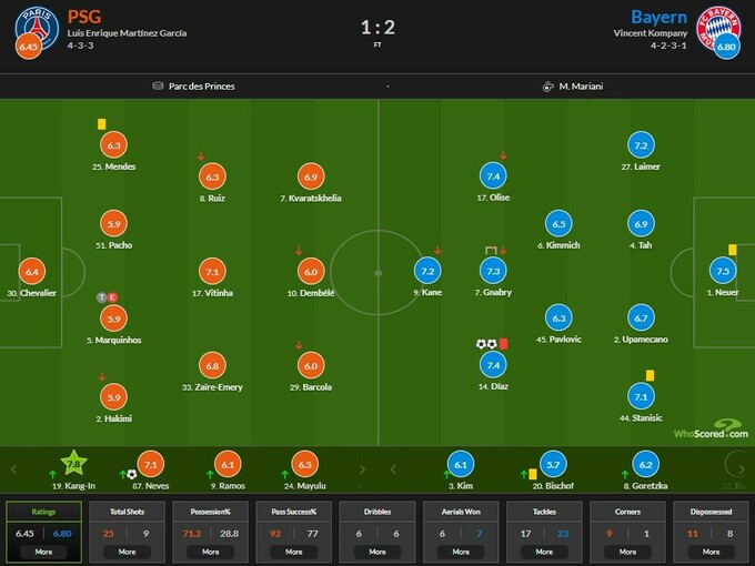 Оценки WhoScored за матч ПСЖ – Бавария – 1:2