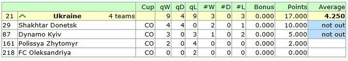 Таблица коэффициентов. Успешный четверг: Украина поднялась на одну позицию