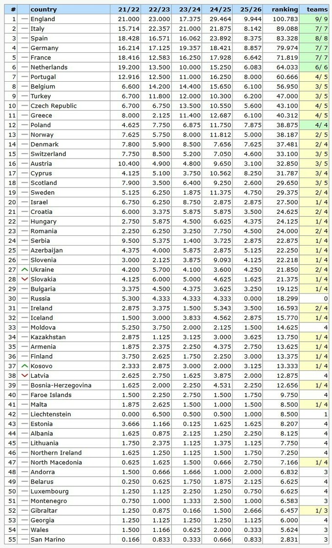 Словакия (21.375) осталась позади (Слован проиграл 3-й матч подряд в ЛК), а главным конкурентом сверху теперь является Словения (22.218).