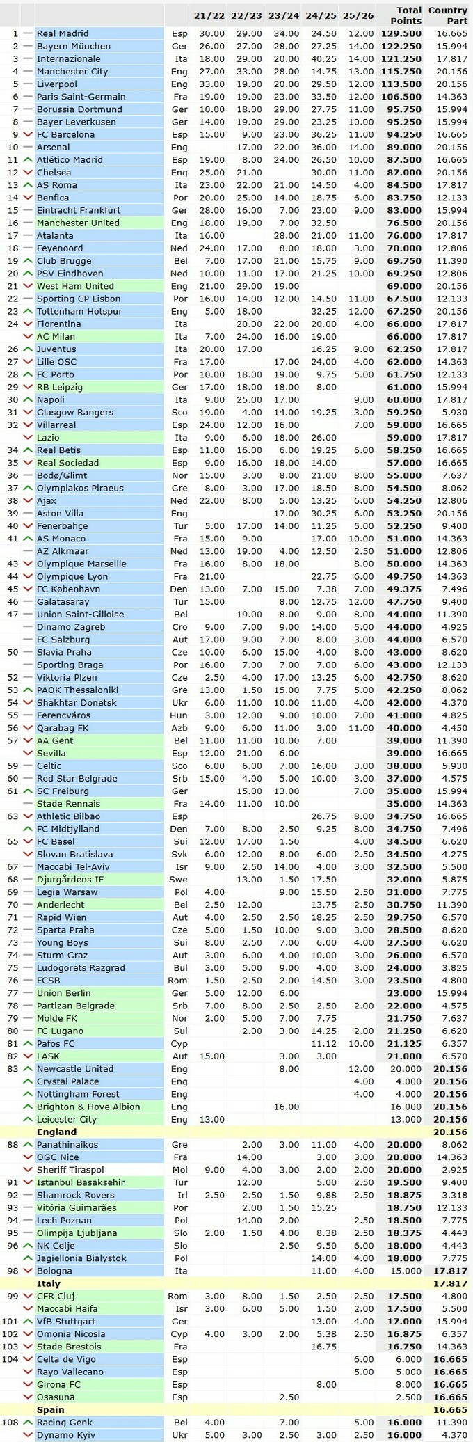 Завершилась очередная неделя еврокубков, и таблица коэффициентов УЕФА получила изменения.