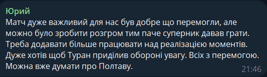 Юрий: Матч очень важен для нас, хорошо что победили, но можно было сделать разгром, тем более соперник давал играть. Надо прибавлять, больше работать над реализацией моментов. Очень хотел, чтобы Туран уделил обороне внимание. Всех с победой. Можно уже думать о Полтаве.
