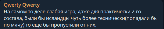Qwerty Qwerty: На самом то деле слабая игра, даже для практически 2-го состава, были бы исландцы чуть более технически(попадали бы по мячу) то еще бы пропустили от них.