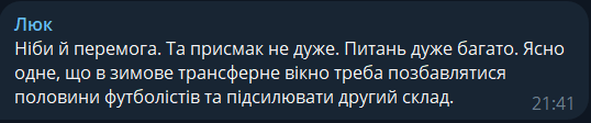 Люк: Вроде и победа. Но привкус не очень. Вопросов очень много. Ясно одно, что в зимнее трансферное окно нужно избавляться от половины футболистов и усиливать второй состав.