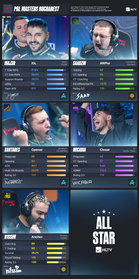 Его молодой соотечественник Али «Wicadia» Хайдар Ялчын, воспитанник академии Eternal Fire, также проявил себя великолепно. В Бухаресте он показал 1.11 KPRW и 110.4 ADRW, с рейтингом выше 1.00 в 87% сыгранных карт и средним 1.31 в выигранных мапах Aurora. Именно стабильность позволила ему получить статус топ-EVP турнира.