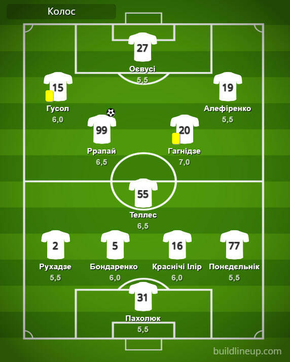 «Колос»: Пахолюк — Рухадзе (Цуриков, 46), Бондаренко, Красничи Ильир, Понедельник — Ррапай (Демченко, 90+1), Теллес, Гагнидзе — Гусол (Салабай, 56), Оевуси (Климчук, 56), Алефиренко (Кане, 46).