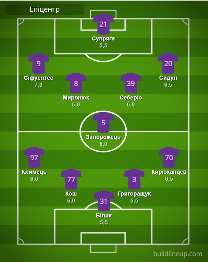 «Эпицентр»: Билык – Климец, Кош, Григоращук, Кирюханцев (Савчук, 59) – Миронюк (Джеоване, 59), Запорожец (Е. Демченко, 59), Себерио (Липовуз, 73) – Сифуэнтес, Супряга (Борячук, 59), Сидун.
