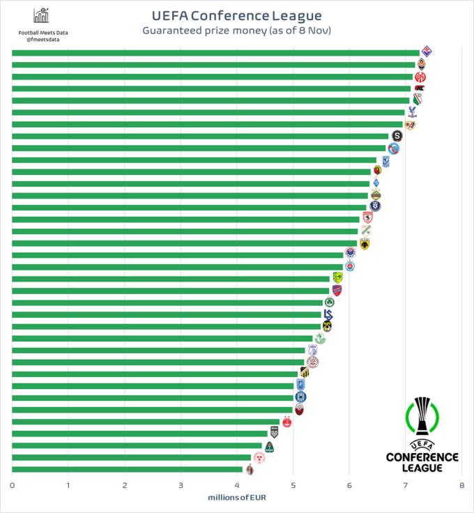 По общей сумме заработанных средств «Шахтер» является вторым среди всех участников текущего розыграша основного этапа Лиги конференций, а «Динамо» находится на 12-й позиции.