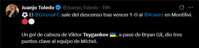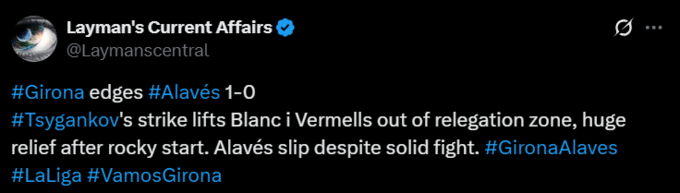 Layman's Current Affairs: Гол Цыганкова вывел Жирону из зоны вылета, огромное облегчение после неудачного старта. "Алавес" проигрывает, несмотря на упорную борьбу.