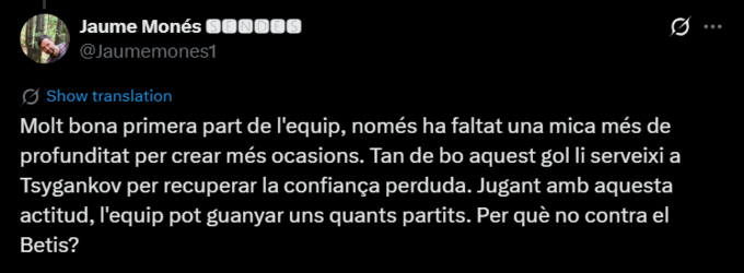 Jaume Mones: Команда отлично сыграла в первом тайме, просто не хватало немного глубины, чтобы создать больше моментов. Надеюсь, этот гол поможет Цыганкову вернуть утраченную уверенность. С таким настроем команда может выиграть несколько матчей. Почему бы не против «Бетиса»?