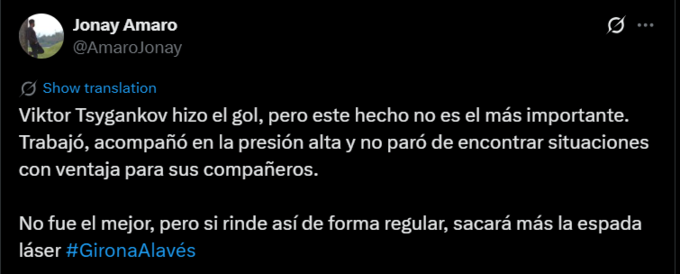 Jonay Amaro: Виктор Цыганков забил гол, но это было не самое главное. Он усердно работал, поддерживал высокий прессинг и постоянно создавал голевые моменты для своих партнёров. Он не был лучшим игроком, но если он будет играть так регулярно, то станет гораздо важнее.