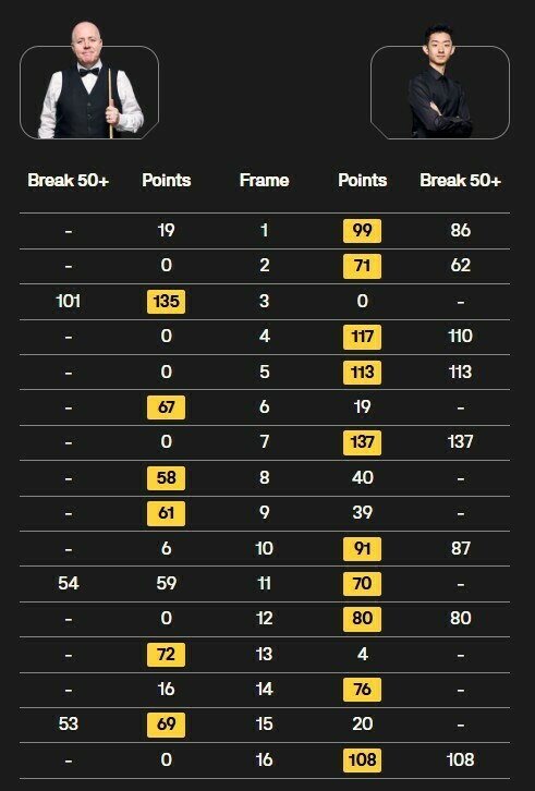 Сегодняшнее противостояние стало четвертым по величине возрастным разрывом в финале рейтингового турнира. Наибольший был 30 лет между Дином Цзюньхуем и Стивом Дэвисом в финале UK Championship 2005 года.