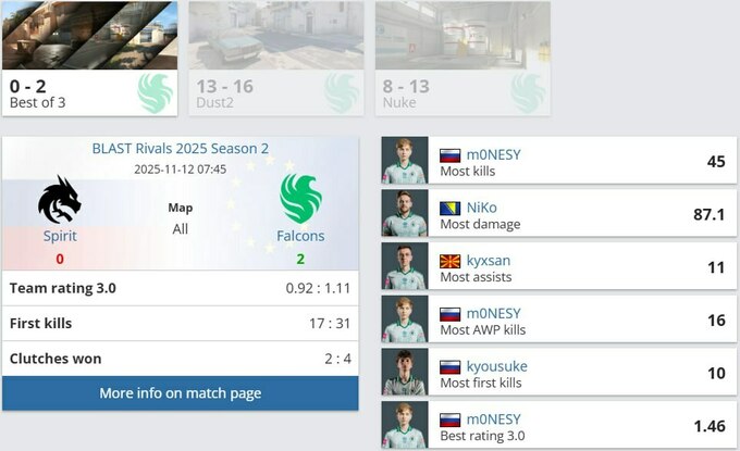 На карте Dust2, выбранной Spirit, Falcons одержали победу в овертайме – 16:13, после двух равных половин (6:6). Главным героем встречи стал Максим «kyousuke» Лукин, оформивший два эйса и завершивший карту с рейтингом 1.54 на стороне защиты.